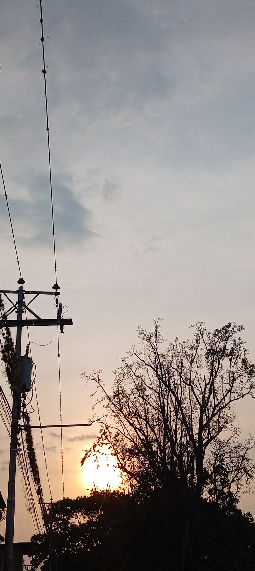 view in Tinaquillo, Venezuela, at sunset or sunrise. An electrical pole with wires is visible on the left side. The sun is partially obscured by trees. The sky is light with some clouds. No people or animals are visible.