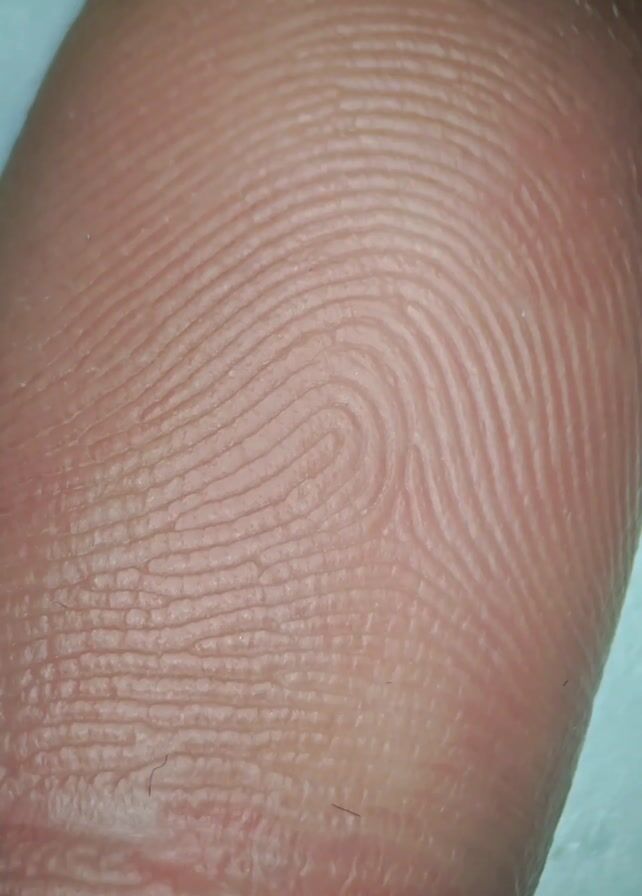 A hand with the middle finger extended appears in front of a microscope on a white desk. On the desk are various objects, including a can of Pringles, a rock, and a jar with green plants. The microscope is light purple and has a camera attached to the top. There are posters of space and planets on the wall behind the desk. The video then cuts to a close-up shot of the fingerprint on the middle finger, showing the distinct lines and patterns of the fingerprint.