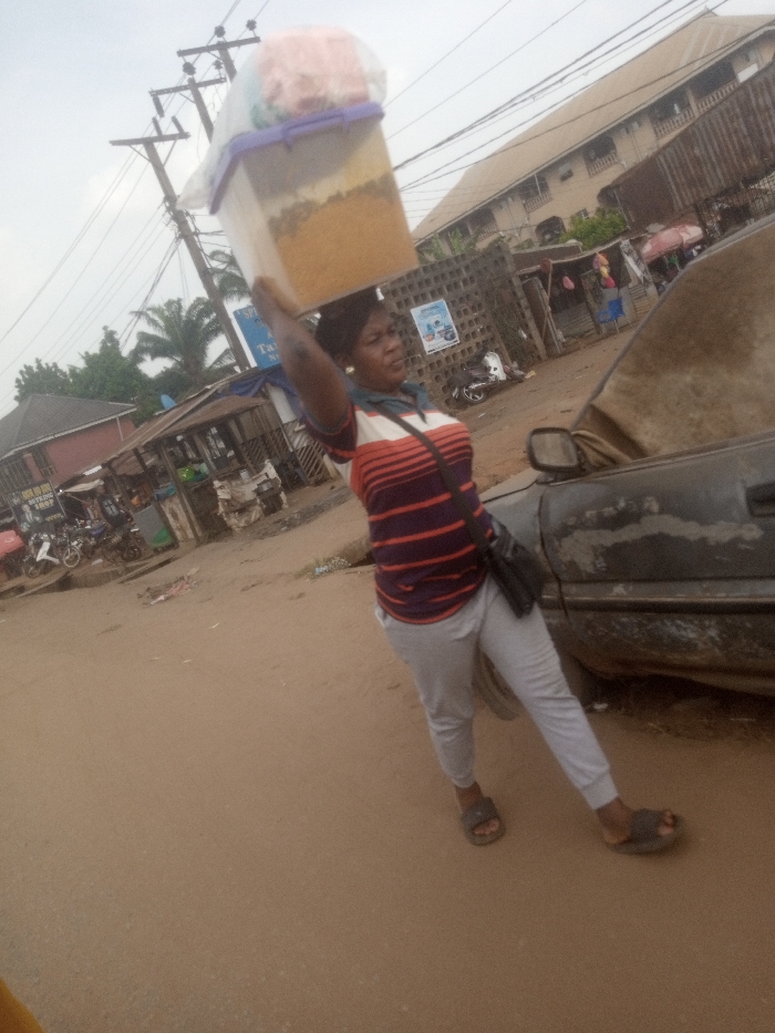 The image depicts an unpaved, light brown dirt road in Nsugbe, Nigeria, under an overcast sky. A woman, estimated to be in her 30s-40s, is captured mid-stride, moving towards the right side of the frame, balancing a large, tall, clear plastic container with a purple lid on her head. The container's lower section contains a light brown granular substance, topped by a clear plastic bag holding pink items. She wears a short-sleeved polo shirt with horizontal white, red, and dark blue stripes, light gray jogger-style trousers, and dark slide sandals. A black shoulder bag is worn across her body, and her right arm is slightly raised, assisting with the balance of the head-load. To her immediate right, the front passenger side of a dark-colored sedan, heavily coated in dirt or dust, is partially visible. The background features a street scene with several small, makeshift market stalls constructed with corrugated metal roofs. Multiple motorcycles are parked near these stalls. Utility poles with numerous overhead wires are visible against the sky in the upper left. A blue sign, partially obscured, indicates "SPRINT" and "NSU..." on a brick wall structure. Further back, a multi-story building with a brown roof and balconies is visible.