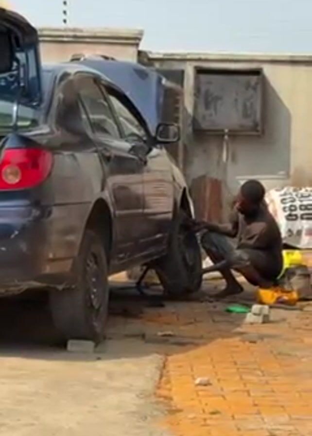 man working on a blue sedan car with the trunk and hood open. The car is raised on a jack with the front driver's side wheel removed. The man is wearing a brown shirt and dark shorts. He is barefoot and appears to be working on the brakes. The scene takes place outside on a brick-paved area next to a white building.