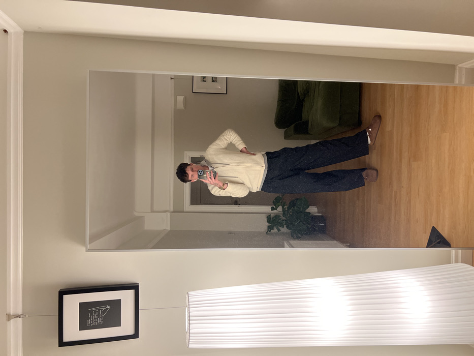 A person stands in front of a mirror, taking a selfie. They wear a cream-colored zip-up sweater, dark blue pants, and brown shoes. The reflection shows a living room setting with a green couch, wooden floor, and a potted plant. Below the mirror, a framed artwork hangs on the wall, and a white pendant lamp is visible.