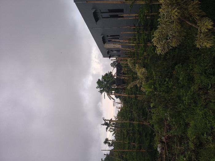 A cloudy sky dominates the frame, contrasting with a building on the right side. Lush green foliage, including what appear to be trees with tall, slender trunks, covers the landscape. Some plants exhibit a yellowish hue. The scene suggests a natural environment bordering a built structure on a day with overcast conditions.