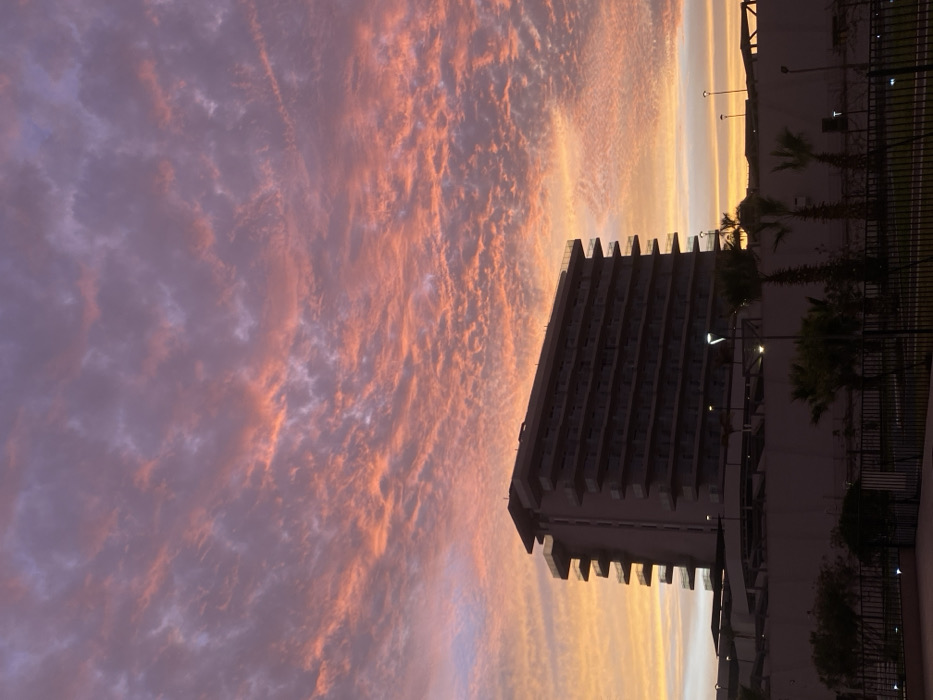 The image captures an outdoor scene in Arica, Chile, during either sunrise or sunset, characterized by dramatic natural lighting. The sky occupies the upper two-thirds of the frame, displaying vibrant altocumulus cloud formations heavily saturated with colors ranging from deep purple at the zenith, transitioning through intense pink and orange, to a soft yellow-orange near the horizon. The primary subject is a multi-story building, identified as the Hotel Arica, rendered in a dark silhouette against the brightly lit sky. This modern structure features a prominent, stepped architectural design on its left side, with multiple cantilevered balconies visible across approximately nine floors. Below the main building, a dark, horizontal wall or lower structure extends across the mid-ground. Several dark, silhouetted palm trees are sparsely distributed in front of this wall, alongside illuminated streetlights or lampposts. The immediate foreground features a dark metal fence or railing, behind which minimal dark foliage is discernible. No individuals are visible within the frame.