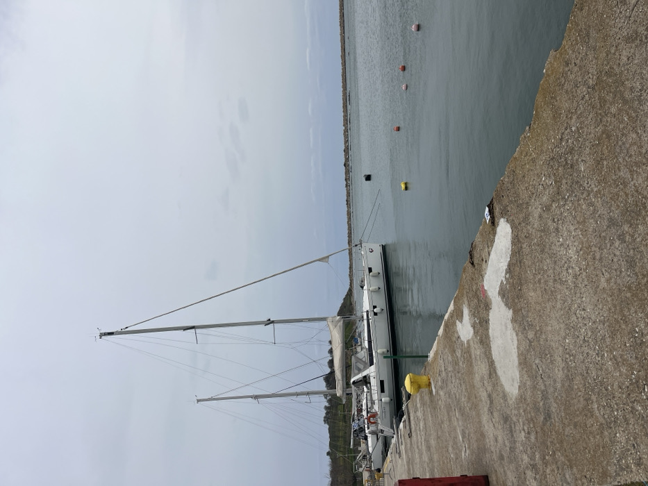 This image depicts a marina in Limenas Avdiron, Greece, under an overcast sky. In the foreground, a weathered concrete pier extends from the lower left to the lower right, featuring irregular white patches and small scattered debris on its surface. A yellow cylindrical bollard is prominently located on the pier, slightly to the left of the center, with a red vertical structure partially visible on the far left edge. The midground showcases calm, dark grey-green water where several sailboats are moored. The primary subject is a large, white sailing yacht with a grey stripe along its hull, equipped with two masts and multiple black cylindrical fenders attached to its starboard side. Mooring lines extend from the yacht. Floating in the water are one yellow cylindrical buoy, three red spherical buoys, and one black cylindrical buoy, spaced across the visible water surface. The background consists of a low, green-vegetated landmass or hill on the left. The horizon is marked by a long, low-lying grey stone breakwater extending horizontally across the mid-distance. The sky above is uniformly overcast, presenting a light grey color with no distinct cloud formations. No people are present in the scene.