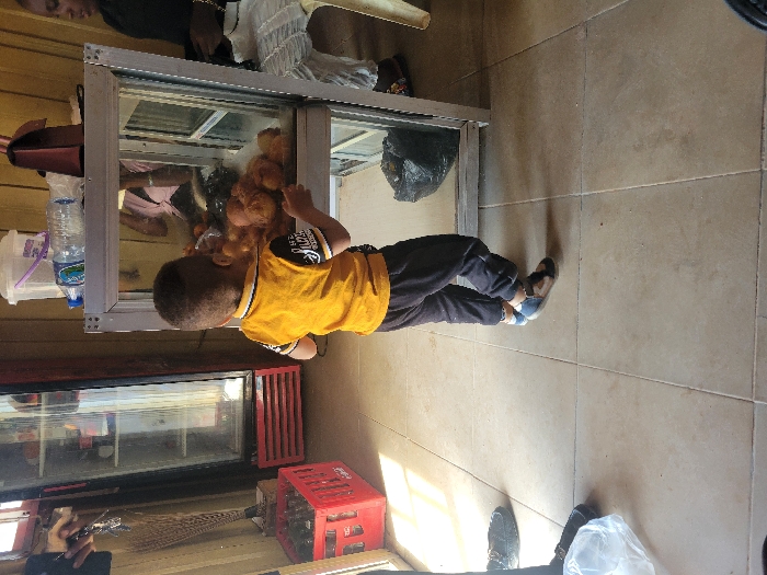An indoor commercial setting in Gura Top, Nigeria, features light-colored tiled flooring and walls. A young male child, viewed from behind, wears a yellow and black short-sleeved shirt, dark pants, and sandals. He stands before a silver-framed glass display case filled with numerous golden-brown fried dough items on multiple shelves, with his hands positioned near its lower opening. A black plastic bag is visible on a lower shelf of the display case. The top of the case holds a purple plastic bucket, several plastic water bottles, and a dark red handbag. To the child's left, a black commercial refrigeration unit with a glass door stands beside a red plastic crate containing glass bottles. A traditional broom leans against the adjacent wall. The lower legs and feet of a person in dark shoes are visible on the far left, near a clear plastic bag on the floor. On the far right, a person is seated on a light-colored plastic chair, wearing white patterned pants and dark sandals; their reflection is visible in the display case glass. Natural light illuminates the area from the left.