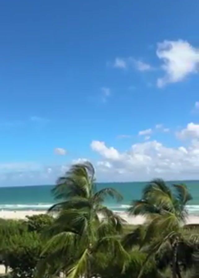 From a high vantage point, a view unfolds featuring a vibrant blue sky dotted with scattered white clouds. In the foreground, several tall, slender palm trees sway in the wind, their lush green fronds fluttering. Beyond the trees, a sandy beach stretches along the shoreline, with gentle waves lapping at the edge of the turquoise sea. The overall atmosphere suggests a warm, sunny, and breezy day at a tropical beach location.