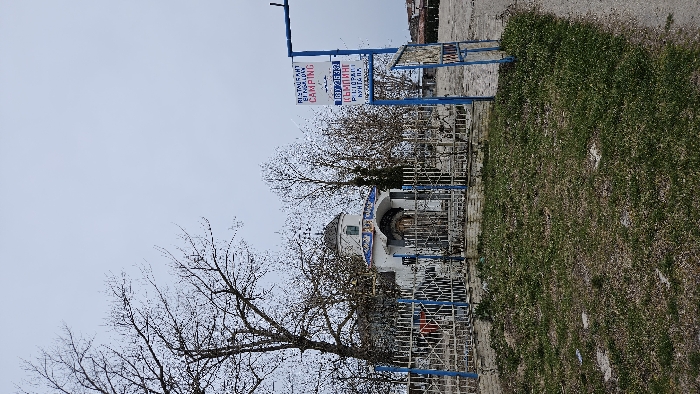The scene depicts an outdoor area in Durankulak, Bulgaria, under an overcast sky. A small, white chapel-like building with a domed roof and blue architectural accents is centrally positioned, enclosed by a white metal fence with blue posts atop a low brick wall. The chapel features an arched entrance with a closed, ornate metal gate. Numerous bare deciduous trees are visible behind and around the structure, with some smaller evergreen shrubs. In the foreground, a patch of sparse, green grass covers uneven ground. To the right of the chapel, a blue metal sign structure stands, displaying multiple signs. One sign, printed in English, reads "RESTAURANT" and "CAMPING," with "BIN. NG." partially visible below. Another sign, primarily in Bulgarian, lists "КЪМПИНГ" (Camping), "РЕСТОРАНТ" (Restaurant), and "БУНГАЛА" (Bungalows), along with a phone number (0879 216 332). A dirt path or undeveloped area extends to the right, with distant buildings partially discernible in the background. No individuals are present in the frame.