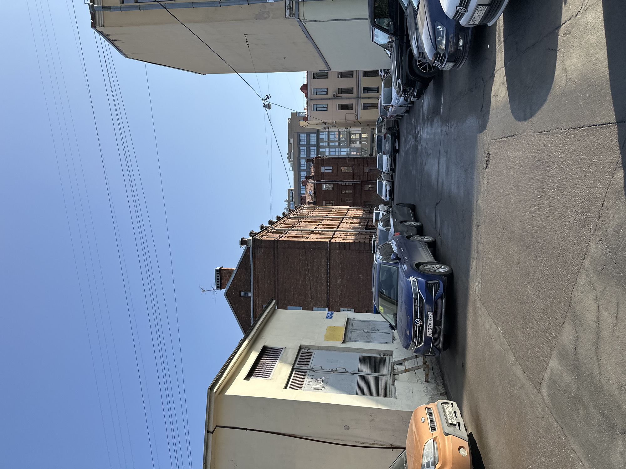 The scene depicts an urban alleyway or narrow street in Saint Petersburg, Russia, under a clear, bright blue sky traversed by numerous overhead utility lines. The ground is an asphalt surface with visible cracks and some darker, possibly damp, patches. Strong sunlight from the left casts distinct shadows on the right side of the roadway. On the immediate left, a single-story, light yellow-beige utility building stands. Its facade features two large grey metal service doors, one stenciled with "7924" and a triangular warning symbol, and a smaller grey door to its right. A rusty, folded metal ladder rests against the wall below these doors. A brown conduit runs vertically up the building's left side. Partially visible in the far left foreground is the front of an orange Kia Soul, bearing the Russian license plate X582HY 198. Parked next to the yellow building is a blue Volkswagen SUV, displaying a disabled parking sticker on its windshield and the Russian license plate A107EH 778. Behind these, a multi-story, dark red brick building with multiple windows and a chimney is prominent. Further down the left side, several other vehicles are parked, including a dark grey SUV, a white sedan, and another dark sedan. On the right side of the frame, a tall, light yellow-beige building with a prominent vertical drainpipe marks the foreground. Extending into the mid-ground on this side is a line of parked cars, beginning with a black Mercedes-Benz G-Wagen, followed by various dark-colored sedans and SUVs, one of which has a partial Russian license plate O70VE 178. In the background, a mix of historic multi-story brick buildings and a more modern building with numerous windows are visible. A street light fixture is suspended from overhead wires in the mid-distance. No individuals are present in the scene.