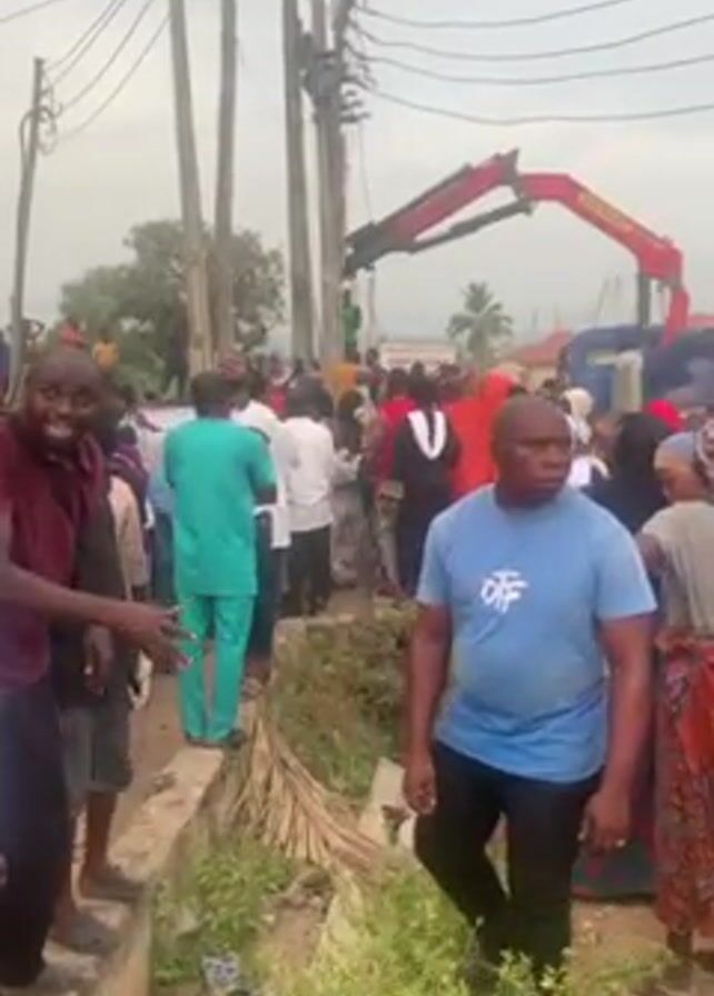 crowd of people gathered on a street, near power lines and a large red truck with a crane. A man in a maroon shirt is on a concrete walkway, gesturing and looking at the camera. A man in a light blue shirt and black pants stands nearby, looking in the opposite direction. The crowd includes people wearing various styles of dress, including traditional African clothing and hijabs. The truck's crane is raised, positioned near the power lines. The environment looks like a residential area with vegetation growing near the walkway. The overall scene suggests an event or situation that has attracted a large gathering of onlookers.