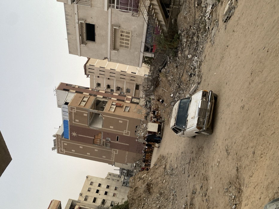 The image displays an urban scene in Khan Yunis, Palestinian Territory, characterized by extensive structural damage and debris under an overcast sky
