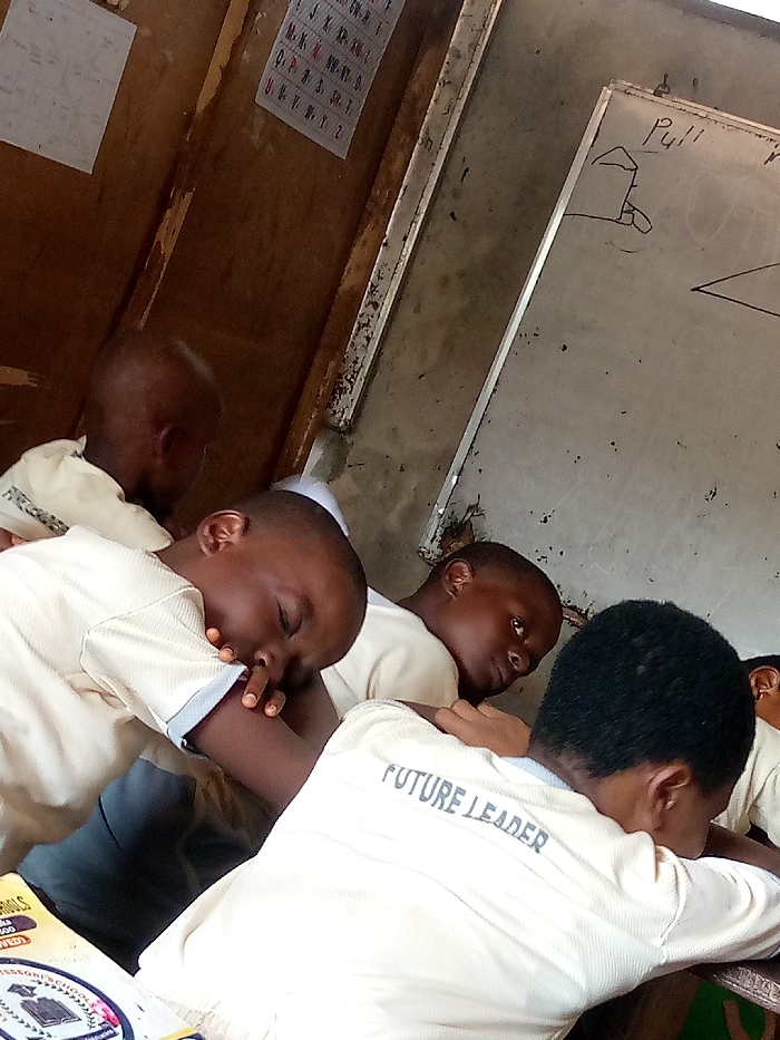 The image depicts an interior classroom scene in Ukwu-Abwa, Nigeria, featuring five young male students. All students are wearing light-colored, short-sleeved uniform shirts; one shirt visibly displays "FUTURE LEADER" in dark text across the back. In the foreground, a student with short hair is asleep, resting his head on his folded arms on a wooden desk, with his right hand near his mouth. Behind him, another student is also resting his head on his arms, looking towards the right side of the frame. A third student in the mid-ground on the right is similarly resting his head on his arms. Two additional students are partially visible in the background; one faces away from the camera, and the other is barely discernible on the far right. The classroom environment includes a white board on the right side of the frame, marked with the word "Pull," a simple drawing of a hand pulling an object, and a geometric triangle shape. The white board shows scattered black marks. To the left, a wooden wall features two pieces of paper affixed: a larger chart with an alphabet and number sequence (e.g., J-Z, 1-2) and a smaller blank white paper above it. Both the wooden wall and the adjacent wall or partition on the right exhibit signs of wear and age. On the desk in the immediate foreground, a colorful sheet, possibly a book cover, is visible, displaying text and an emblem that includes "MONTESSORI SCHOOL." Natural light illuminates the scene.