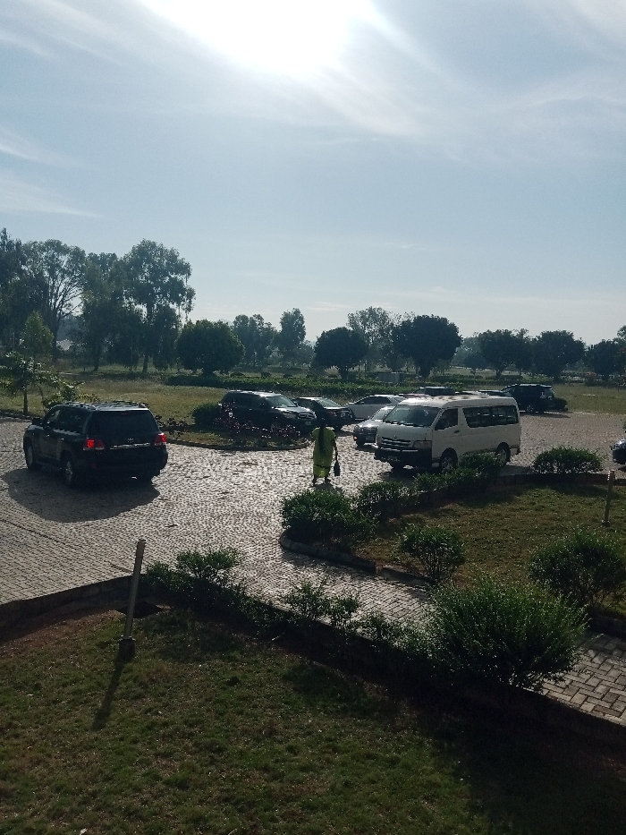 The image depicts an outdoor scene in Unknown, Unknown, under bright, direct sunlight, likely late morning to early afternoon, with a clear sky and some wispy clouds. The ground features a large, patterned paved surface resembling cobblestones or interlocking bricks, which reflects sunlight intensely. Adjacent to this paving are sections of green grass, bordered by low, dense green shrubs and a low concrete or stone retaining wall. A slender, dark pole is embedded in the grass in the lower-left foreground, casting a shadow. Multiple vehicles are stationary on the paved area. On the left, a dark-colored SUV, appearing to be a Toyota Land Cruiser, is parked, facing away from the viewer. In the midground, a white passenger van, resembling a Toyota Hiace, is parked, facing towards the right. Behind the white van and extending towards the right, at least four other vehicles are visible: a dark sedan, a light-colored sedan, another dark sedan or SUV, and a partially visible dark SUV on the far right. One individual is observed in the midground, walking across the paved surface from left to right, away from the camera. The person is wearing a light green, loose-fitting, traditional-style garment and is carrying a dark object in their left hand. The background consists of a dense line of various trees with green foliage under a slightly hazy blue sky.