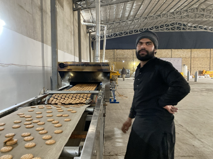 The scene depicts an indoor industrial food production facility located in Kandahar, Afghanistan. In the foreground, an adult male with a dark beard and mustache, wearing a black knitted beanie and a black shalwar kameez, stands, his body angled slightly left of the camera while his face is turned directly towards it. His left hand is positioned behind his back. To his left, a stainless steel industrial conveyor belt system is actively transporting numerous light brown, round biscuits, many featuring a ridged or wavy pattern; some are paired as sandwich cookies. This conveyor system feeds into a large industrial unit, likely an oven or cooling tunnel, prominently displaying the text "WWW.NEWRAFIQENGINEERINGWORKS.COM" and "MADE IN INDIA". In the distant background, another male figure is visible walking towards the left. The factory environment features high ceilings with exposed metal trusses and a corrugated metal roof, concrete support pillars, and walls with light-colored lower sections and exposed brick in the upper distant areas. Various industrial equipment, including what appear to be gas cylinders and stacked yellow containers, are scattered further back. The facility is brightly illuminated by overhead artificial lighting.