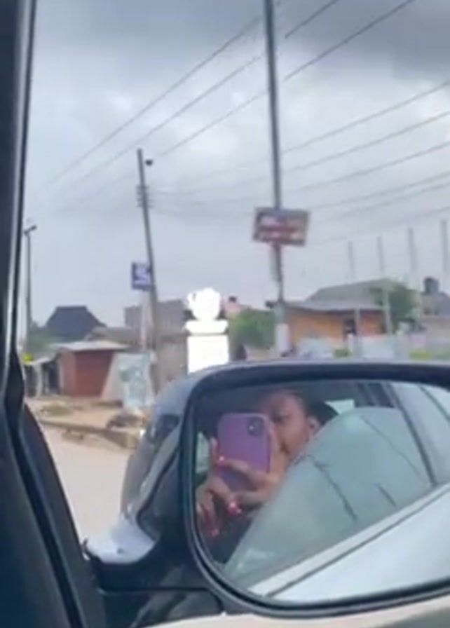 view from inside a car, looking into the side mirror. A woman is visible in the mirror, holding a purple cell phone, seemingly taking a photo or video. Outside the car, the scene depicts a street with overhead power lines and various buildings. Some of the buildings appear to be smaller shops with tin roofs. The sky is overcast, suggesting a cloudy day. The car seems to be moving at a slow pace or stopped in traffic.