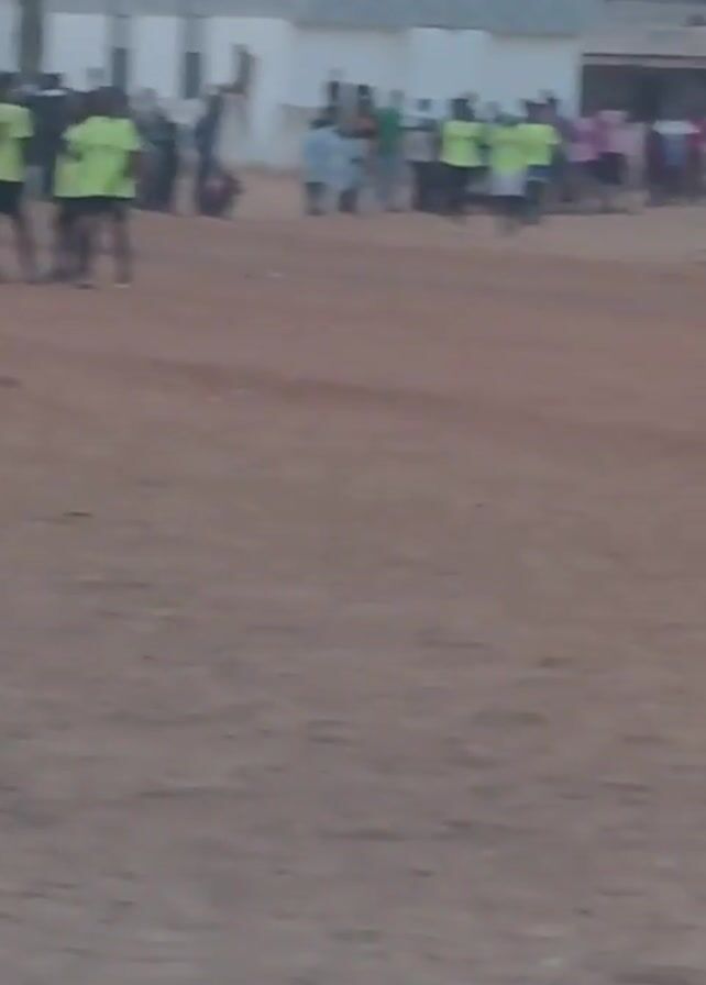 group of people on a sandy field. Several individuals are wearing bright yellow jerseys and dark shorts. Another group is wearing all-white clothing. There are buildings and trees in the background, and a crowd of people appears to be watching. The scene appears to be outdoors during the day.