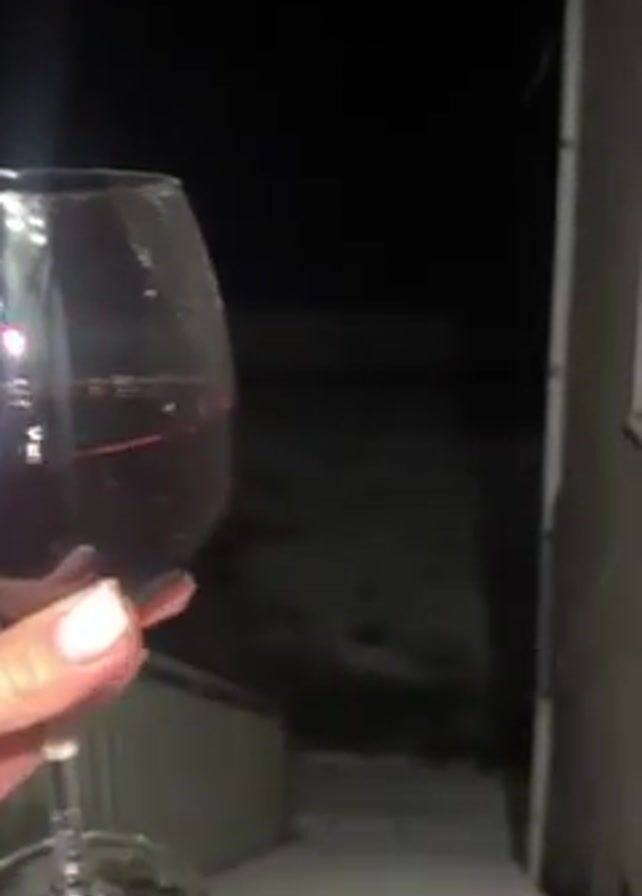 hand holding a wine glass filled with red wine, against the backdrop of a snowy night. The camera then pans down to reveal a set of outdoor stairs leading to a snowy ground area. Snowflakes are visible falling in the dark. The staircase has a white metal railing. The background is generally dark. The setting appears to be the outside of a building at night.
