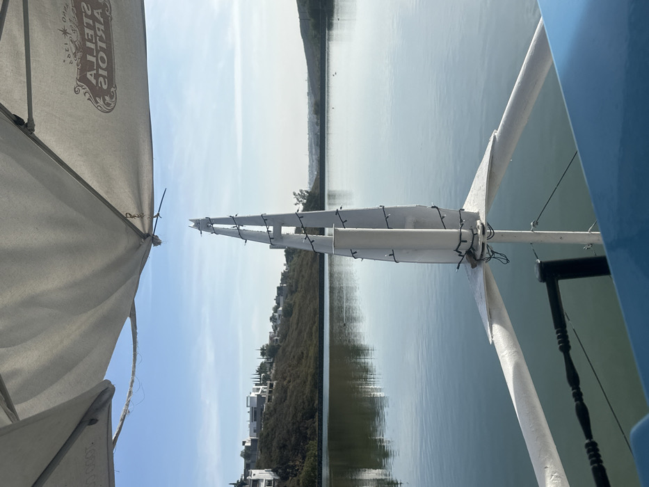 A tranquil view of a calm body of water under a pale blue sky. Reflections shimmer on the water's surface, mirroring the distant shore. A partially visible white sun umbrella with "Stella Artois" branding is in the foreground. A boat or structure with white rails and string lights further defines the foreground, adding a sense of being on the water.