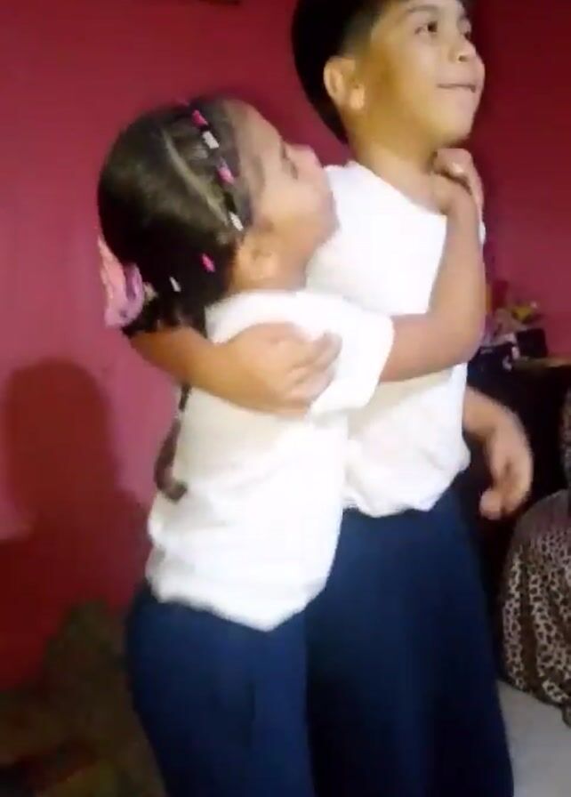 Two children are hugging in a room with a pink wall