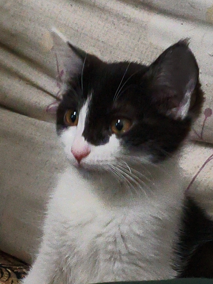 - "A black and white kitten with amber eyes is the focal point" by FM-D16BC3, licensed under CC BY 4.0