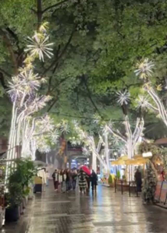 People are walking on a brick pathway, some using umbrellas, under a canopy of trees decorated with white lights. There are some buildings and a restaurant on the side of the walkway. It appears to be dusk or night time.