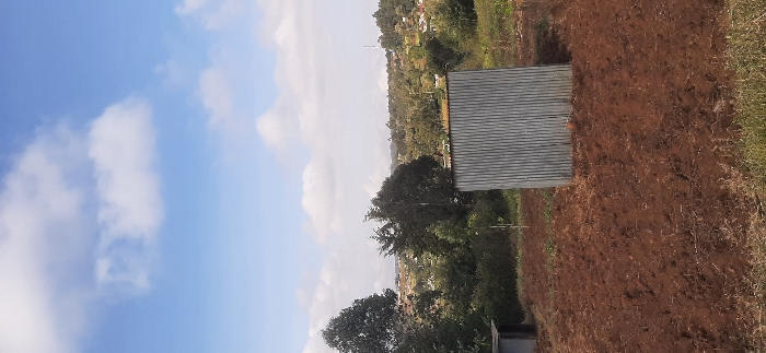 A landscape scene shows a small metal building in a field with reddish-brown vegetation. Rolling hills with houses and trees are visible in the background. A blue sky with scattered clouds occupies the left side of the frame. The photograph is taken from a slightly elevated position, offering a view of the terrain.