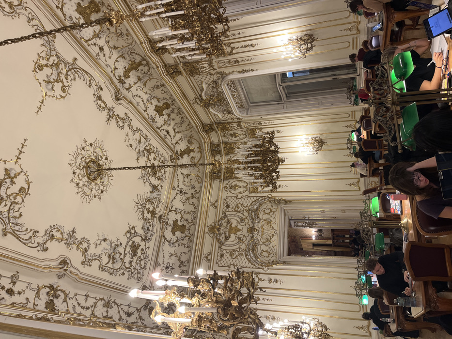 An ornate room with a high, elaborately decorated ceiling featuring gold detailing, chandeliers, and intricate patterns. Rows of wooden desks with green lamps line the walls, occupied by individuals engaged in reading or studying. A window is visible towards the back of the room, casting a subtle light. The space exudes a historical, academic atmosphere.