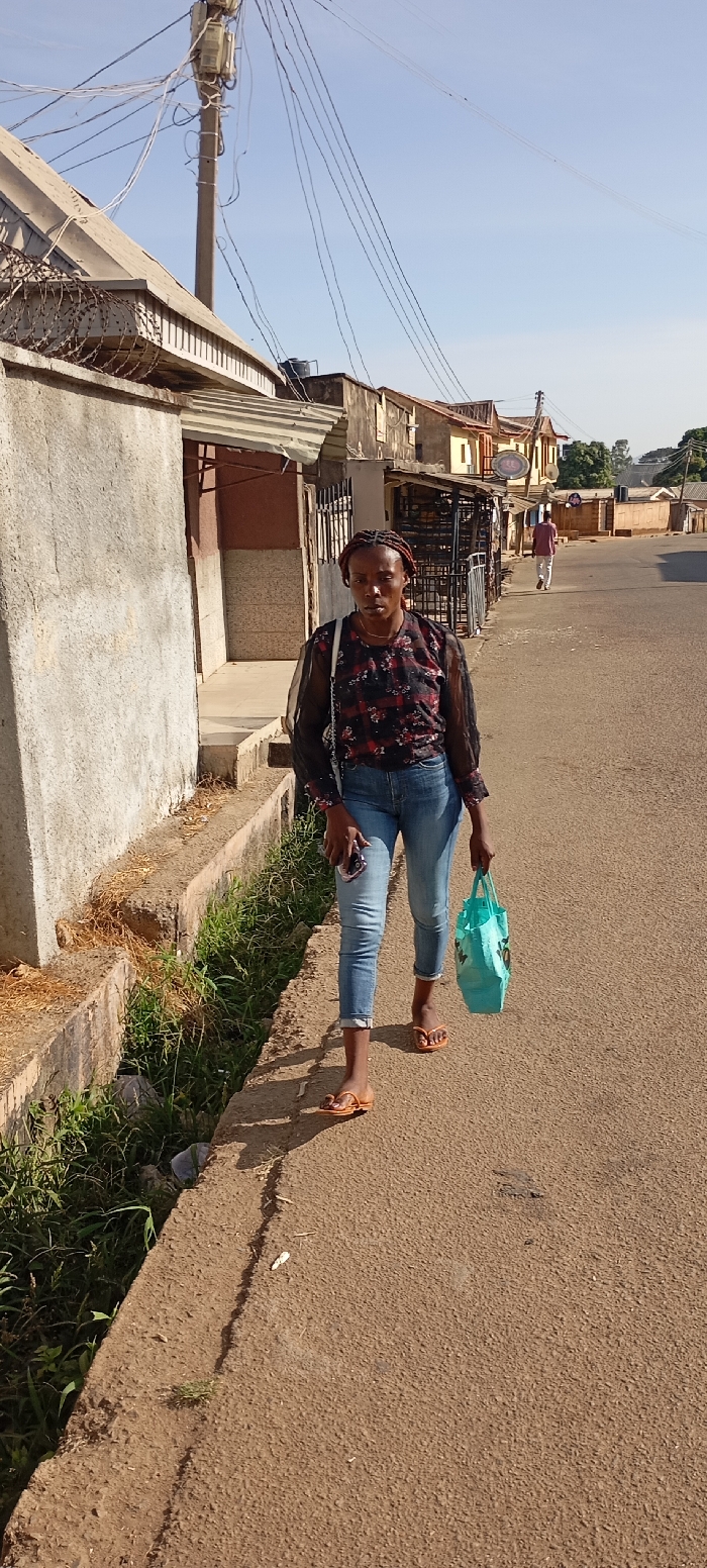 A woman walks towards the camera on a paved street. She is wearing a floral top, jeans, and sandals, and carries a blue tote bag and a phone. Behind her is a man walking in the same direction. The street is lined with buildings of varying heights, some with corrugated metal roofing. Power lines crisscross the sky. A concrete drainage ditch with vegetation runs along the edge of the street. The sky is light blue.