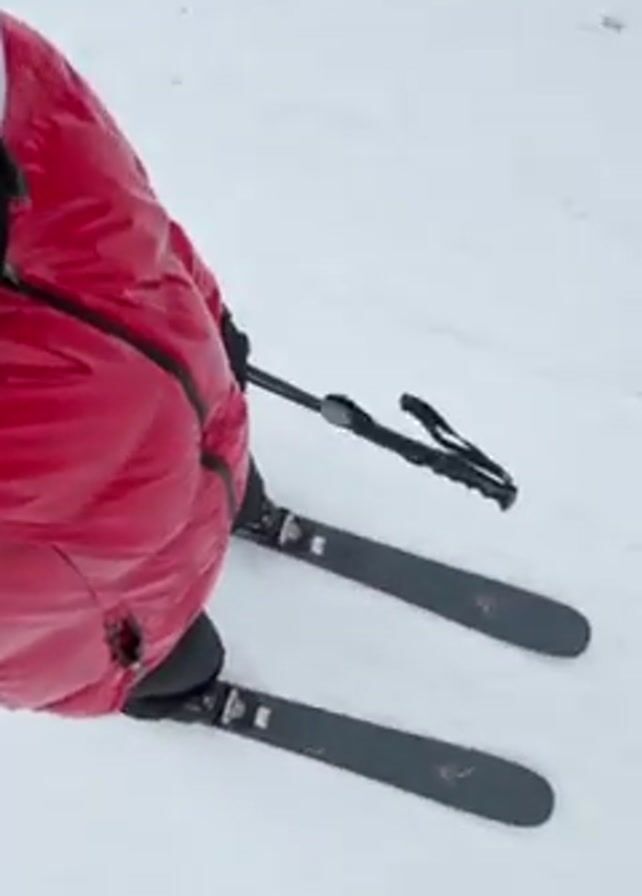 A person wearing a red puffy jacket, black helmet, ski goggles, and a black neck gaiter is skiing down a snowy slope. The person is holding ski poles and is surrounded by other skiers and evergreen trees. The sky is overcast. The camera is focused on the skier and their immediate surroundings. The perspective shifts from a close-up view of the skier to a wider view of the slope and other skiers.