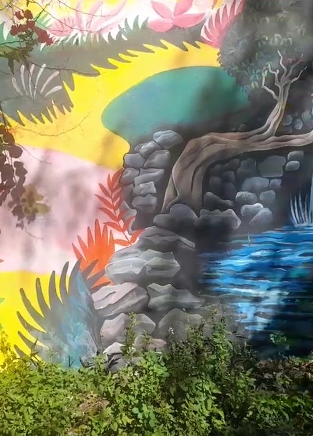 low building with a corrugated metal roof, featuring a painted mural on its wall. The mural includes images of a waterfall, a woman's face, and colorful tropical plants and flowers. Green ground cover plants are growing along the base of the building. The camera pans from left to right to reveal the entire length of the mural. The sky is blue and the sun is shining.