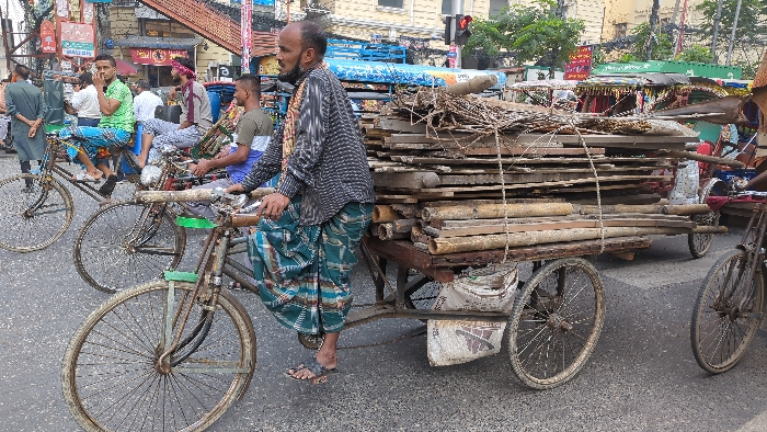 A man on a bicycle-pulled cart carries a heavy load of wood and lumber, secured with rope. He wears a patterned lungi and sandals. Other rickshaws and bicycles are nearby, with men riding or waiting. The setting appears to be a busy street in South Asia. A traffic light is visible in the background. Buildings and shop signs add to the bustling urban scene.