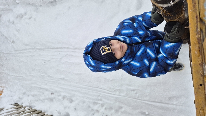 The image depicts an outdoor scene in Kamennyi Kliuch, Russia, during winter conditions. A young male individual, appearing to be a child, occupies the central-right portion of the frame, looking upward towards the camera with a slight smile. He wears a dark blue knit beanie with a yellow "P" emblem, a blue hooded puffer jacket featuring a pattern of light blue horizontal and vertical lines, and dark gloves. His dark boots are partially visible in the snow. His right hand is positioned on a segment of a corroded, cylindrical metal object, likely a pipe or part of a mechanism, which rests on a rusty yellow metal beam extending horizontally across the bottom of the frame. The ground is covered in undisturbed white snow, with subtle tracks visible in the background. A light-colored wooden fence or structure is partially visible along the left edge of the snow-covered area.