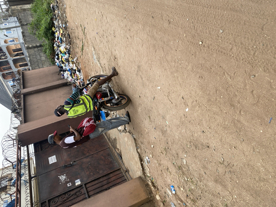 Two men are adjacent to a gate. One sits on a motorbike wearing a green safety vest and shorts. The other man leans back against the gate, holding a phone. Behind the men is garbage lining a wall. Razor wire sits above the wall and gate. A multi-story building is visible in the background. The ground is dirt.