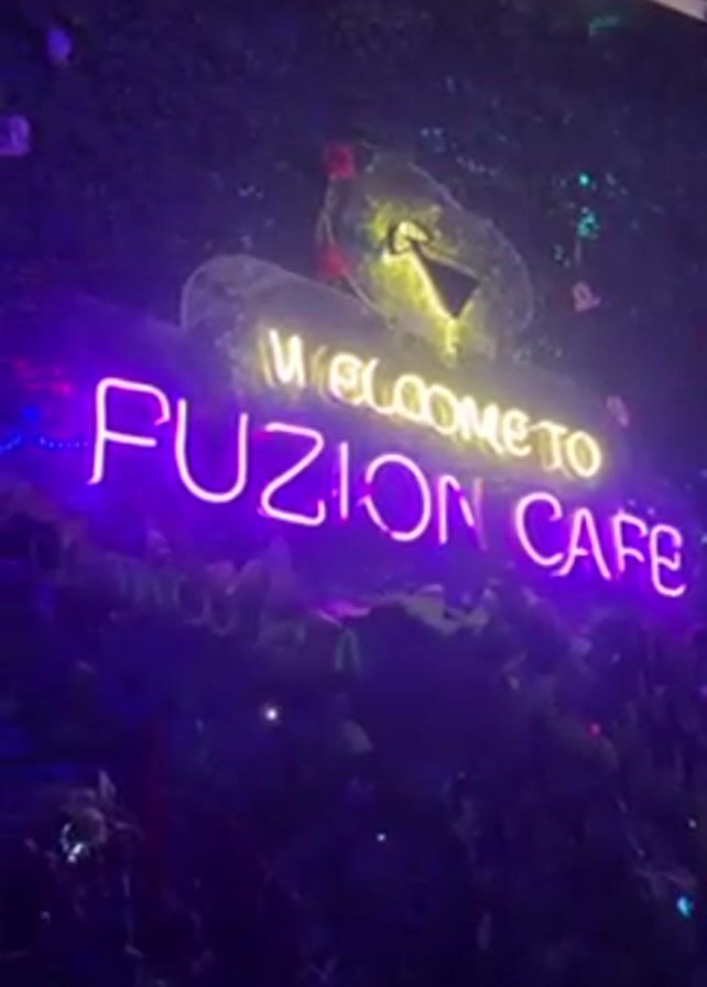 The camera pans upwards to a neon sign in an outdoor setting at night. The sign reads "Welcome to Fuzion Cafe" in purple and yellow neon lights. The sign is mounted on a wall covered in faux greenery, dotted with artificial flowers and foliage. There is a stylized, lit cocktail glass above the words. The lighting is dim, creating a party atmosphere, and there is music in the background.