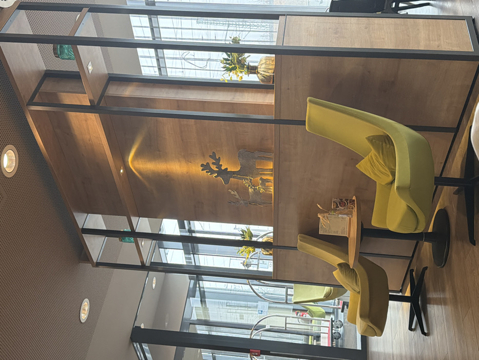 This image depicts a modern, unoccupied hotel lounge or waiting area, specifically within the IntercityHotel Dresden, located adjacent to Dresden Hauptbahnhof (main train station) in Dresden, Germany. The scene features a bright, contemporary interior with a light-colored perforated acoustic ceiling containing recessed circular spotlights. The flooring is a light wood laminate. A prominent vertical wooden partition, framed by dark metal, serves as a central decorative element and partial room divider. This partition is illuminated by upward-facing spotlights. On the lower section of the partition, three stylized metallic deer figures (two adults and one fawn) are displayed. To the right of these figures, a fluted golden vase holds yellow floral arrangements. Further up the partition, on exposed shelves framed by dark metal, two teal/green textured glass objects are visible. In the foreground, two chartreuse green upholstered armchairs with black pedestal bases face each other diagonally. Each chair is accessorized with a matching green throw pillow. Between these armchairs, a small round wooden table with a black pedestal base holds a rectangular menu stand, a small glass vase with dried botanicals, and a small dark container. Through the large, floor-to-ceiling glass windows and dark frames in the background, an urban exterior is visible. Multiple train tracks and railway overhead line equipment are clearly discernible, confirming the proximity to a train station. To the far left, partially obscured, a silver-colored luggage trolley with wheels is positioned near a glass door, suggesting an entrance or exit point within the hotel lobby. No individuals are present in the image.