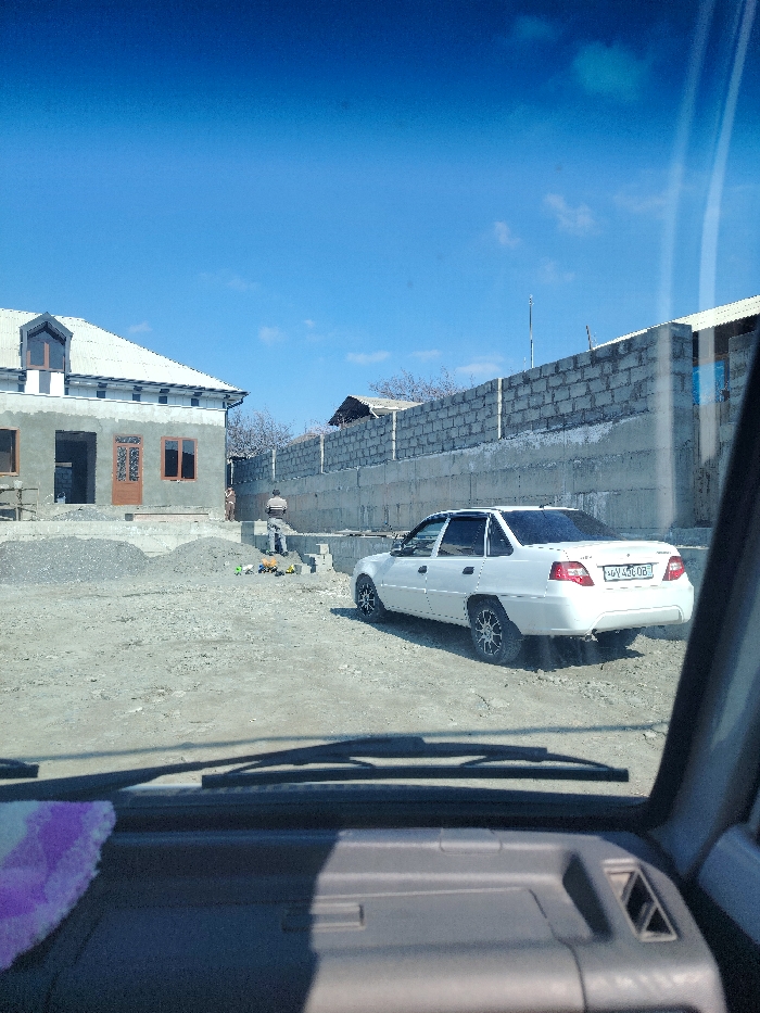 View from inside a vehicle facing a building under construction. A white sedan is parked next to a concrete block wall. A man is working on a pile of bricks between the building and the car. The sky is clear with some cloud cover. The vehicle's windshield and dashboard are visible.