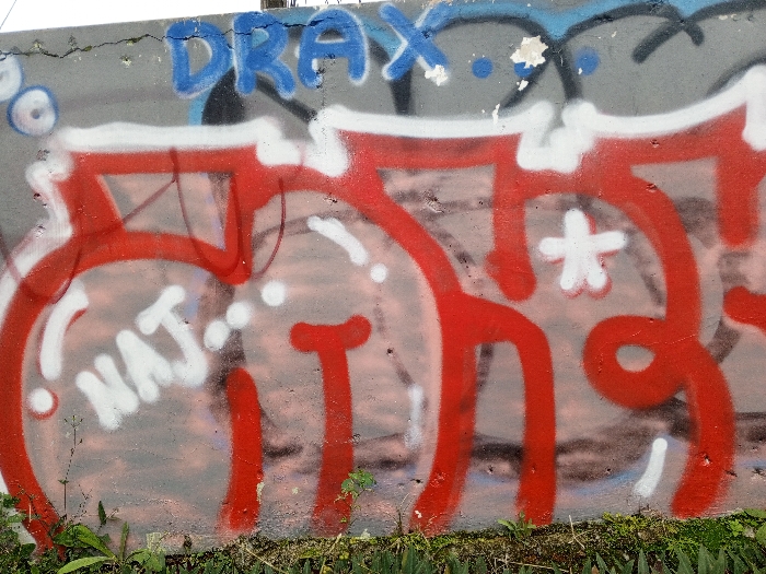 The image displays a weathered, grey concrete wall in Voa Yeav, Cambodia, heavily covered with spray-painted graffiti. At the top of the wall, the word "DRAX" is rendered in blue spray paint with black outlining and minimal white accents. Below this, a large, stylized red graffiti tag occupies the central and lower sections, partially outlined with white spray paint. Within the red tag, the letters "NAJ" are visible in white on the left, accompanied by several white dots. A distinct white five-pointed star shape is also present within the red graffiti, towards the upper right. The concrete surface exhibits fine cracks along its upper edge and general discoloration. Along the base of the wall, a line of green vegetation, including small plants and grass, is visible. No individuals, actions, or interactions are depicted.
