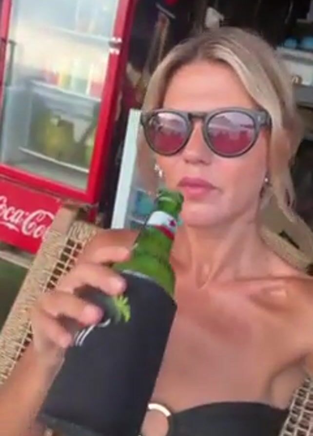 A woman in a black strapless bikini and sunglasses is sitting in a woven chair in front of a Coca-Cola refrigerator. She takes a drink from a green bottle of beer in a black foam holder with a palm tree printed on it. She then makes a kissing face at the camera.