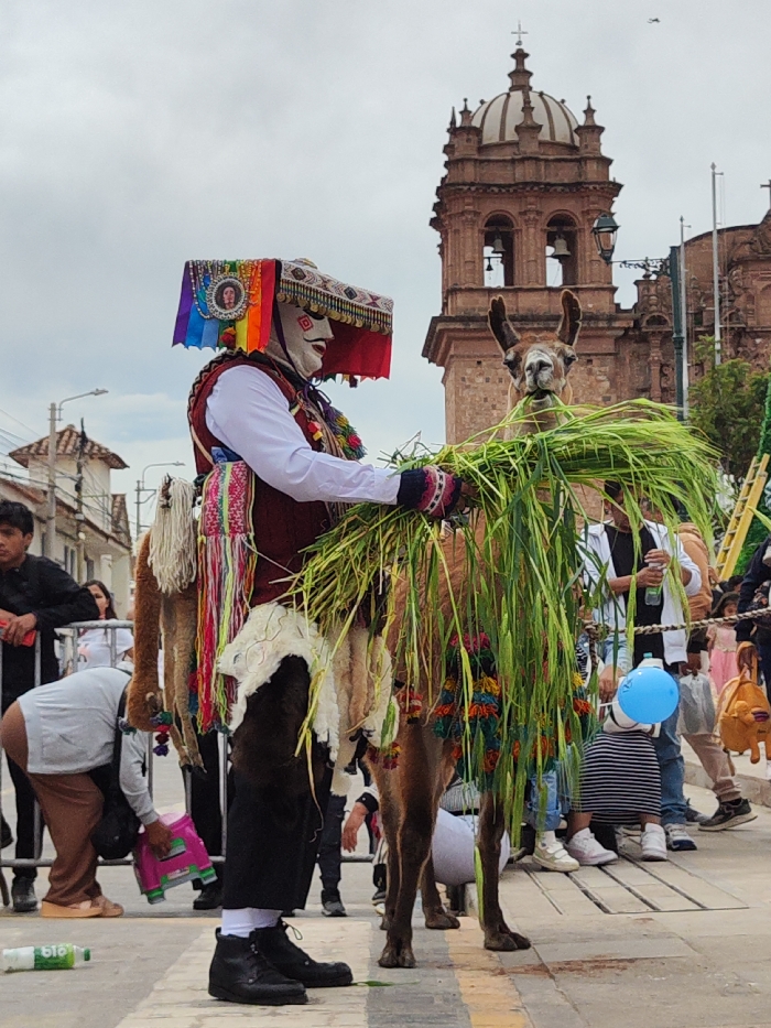 A person in a traditional costume and mask feeds green foliage to a llama. The person's elaborate headdress features a rainbow stripe and a portrait. The llama has colorful tassels adorning its body. People surround them. A church tower rises in the background under a cloudy sky. The event appears to be taking place in a public square.