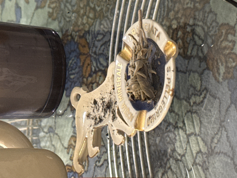 The image presents a close-up, slightly overhead view of several objects arranged on a patterned surface. A white S. Pellegrino branded ashtray, featuring a blue central depression, gold accents on its rim, and two cigarette rests, occupies the center foreground. Inside the ashtray, a bundle of dried, light-grey herbs, consistent with sage, is positioned. This bundle is partially burnt, with black ash and residue scattered within the blue depression. To the left of the ashtray, a white or cream-colored ceramic mug or cup is partially visible. To the right, a dark, possibly translucent, glass or ceramic mug or cup is also partially visible. Beneath and partially surrounding the ashtray is a metallic grid or wire rack. All these objects rest on a flat surface adorned with an intricate, somewhat faded, multi-colored pattern featuring blue, green, and orange floral or abstract designs, suggesting a tiled or patterned glass tabletop. No people are visible. The scene suggests an indoor environment.