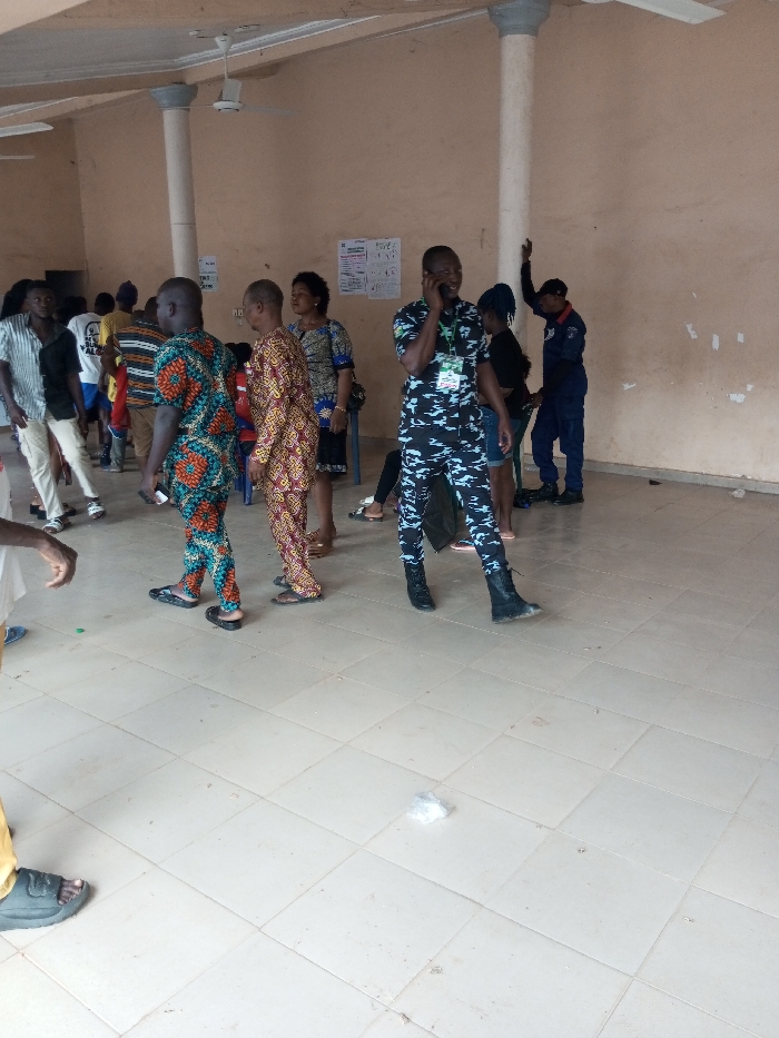 The scene depicts an indoor gathering within a light-brown walled hall featuring light-colored square tiled flooring and multiple white ceiling fans in Ajalli, Nigeria. At least ten individuals, primarily adults, are present. Two light-colored cylindrical columns support the ceiling. Several informational posters are affixed to the mid-ground wall. In the mid-foreground, a male wears a black, grey, and white camouflage uniform with black combat boots and an identification badge on his chest; he is holding a dark mobile phone to his right ear, engaged in a conversation. To his left, two males are walking towards the right; one wears a teal, orange, and green patterned two-piece outfit with dark flip-flops, and the other wears an orange, red, and yellow patterned two-piece outfit with dark flip-flops. Further left, other individuals include a male with long dark hair wearing a striped shirt and light pants, and a female in a patterned dress. In the background-right, a male in a dark blue uniform with a red arm detail and dark cap stands with his left arm raised above his head, directed towards a column. Small pieces of debris, including a crumpled white object and a green object, are visible on the tiled floor.