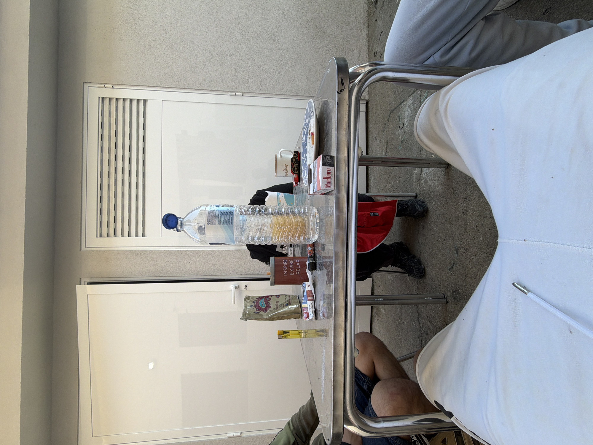 The image depicts an outdoor scene, seemingly on a balcony or patio in Vila Real, Portugal. A metal table is central to the view, cluttered with various items: a large bottle of water, a pack of Marlboro cigarettes, a cup, a plate, various small packages of what appear to be smoking accessories, and a lighter. Two individuals are partially visible; one is wearing blue shorts and another is wearing grey pants. The area has a concrete floor. A building wall with a white door and a ventilation unit can be seen. The light suggests a daytime setting.