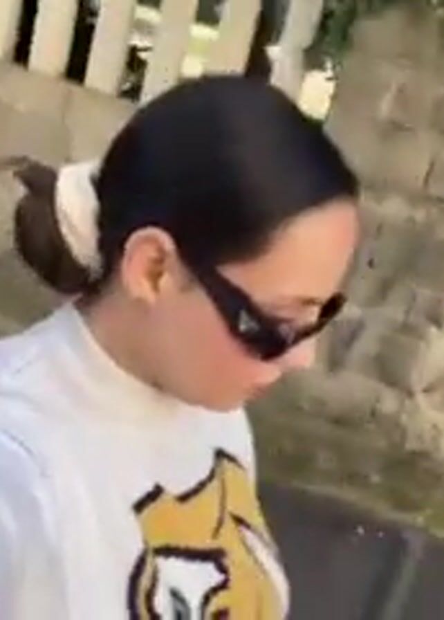 A person with dark hair pulled back in a bun walks down a sidewalk next to a short stone wall with graffiti on it. The person is wearing sunglasses and a sweatshirt with a graphic on it. Trees and buildings are visible in the background. The person appears to be recording a selfie video.