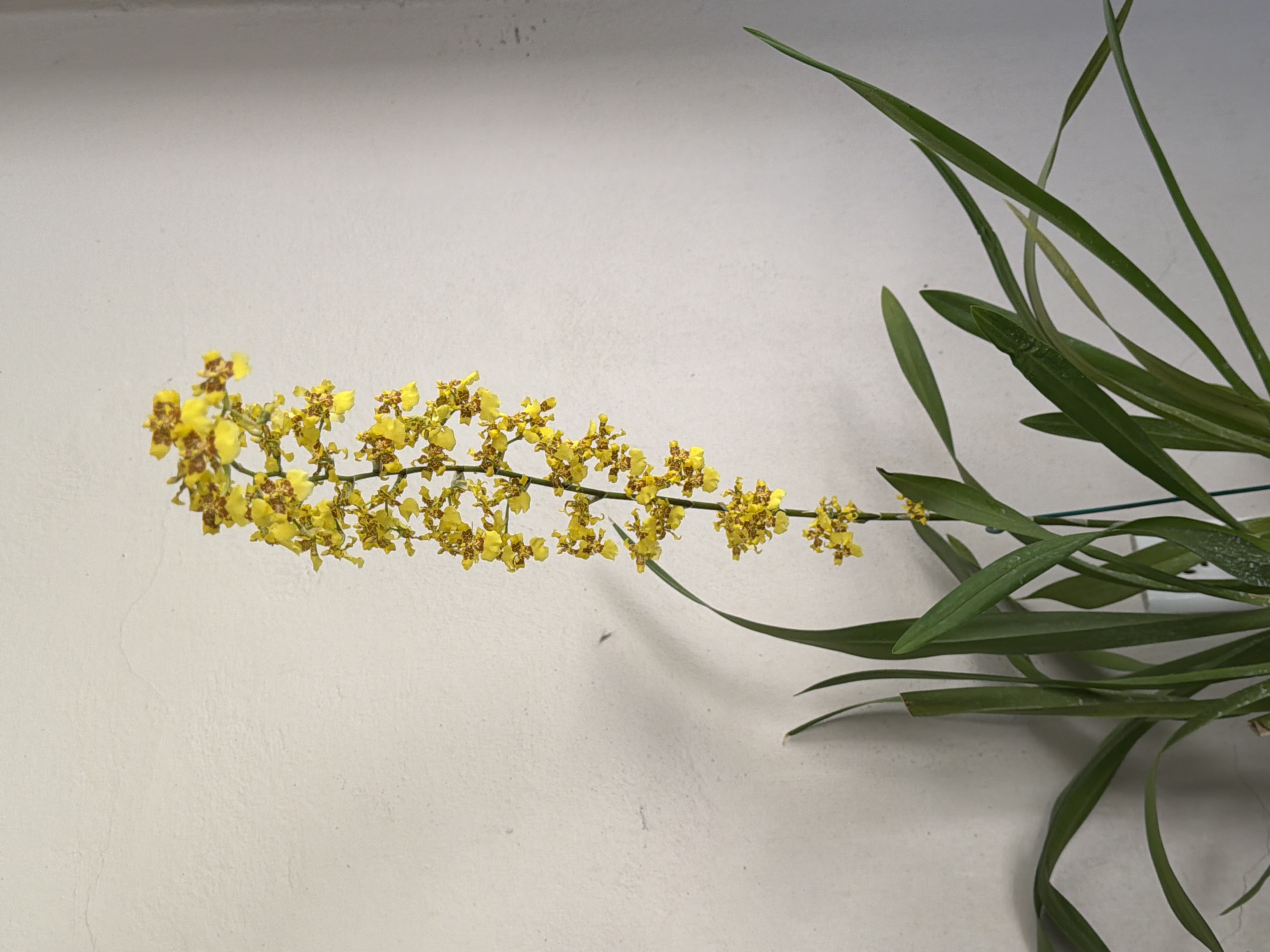 A close-up shot features a flowering plant against a white wall. The plant has long, green, blade-like leaves extending diagonally from the right side of the frame. A stem with small, densely packed yellow flowers with brown specks stretches horizontally from left to right. The background is a plain white wall, likely indoors. The image was taken in the city of Cuautla, Mexico.