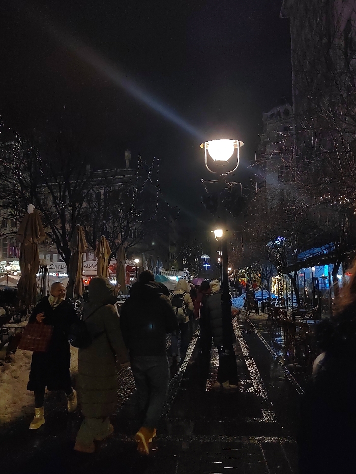 A night scene captures a pedestrian street illuminated by lamplight. People stroll along a wet pavement marked with streaks of slush, their figures silhouetted against the darkness. Bare trees line the street, adorned with festive string lights. Buildings loom in the background, their outlines softened by the night. The overall impression is one of a winter evening ambiance.
