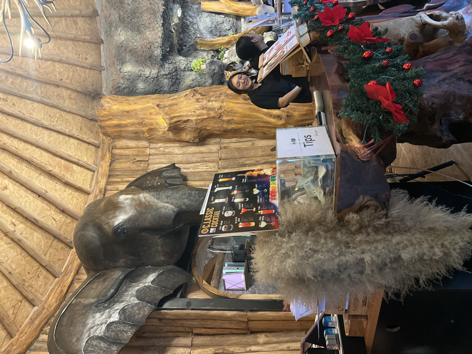 Inside a rustic-themed space, a bar counter constructed from a large tree trunk displays holiday decorations. A woman in a black shirt stands behind the counter. A menu of classic cocktails is propped on a barrel base, near a tip jar. A sculpture resembling a bird or horse head rests near the menu. Fluffy, dry grass adorns the bottom of the counter, adding to the organic ambiance.