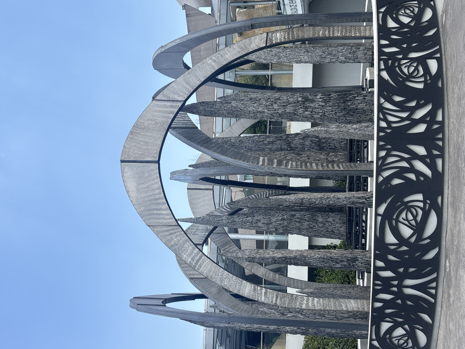 An outdoor wide-angle shot captures the "Fuente del Bicentenario" (Bicentennial Fountain) sculpture located outside Plaza Carso in Polanco, Mexico City, Mexico, under a clear blue sky. The central subject is a large, dark grey metallic sculpture featuring multiple textured, arched structural elements forming an open, dome-like canopy. Beneath these arches, numerous narrower, textured metallic columns of varying heights stand vertically, resembling abstract trees or spires. The entire sculpture is set within a circular base, the outer perimeter of which is adorned with a dark metal screen featuring an intricate, laser-cut organic pattern resembling intertwined roses or foliage. Dark benches are visible within the sculpture's base. In the background, modern architecture with glass facades and some green foliage is present. A partial white sign in the upper right background reads "SALIDA DE VEH..." indicating a vehicle exit. No people are visible in the scene.