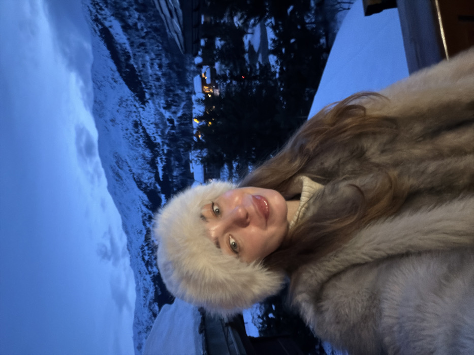 A woman smiles at the camera, wearing a white fur hat and a large, grey fur coat. Her long brown hair peeks out from under the hat. Behind her is a mountainous landscape under a blue sky, with some trees visible in the middle ground. Small lights suggest a town or village in the distance. Snow-covered ground is visible in the foreground.