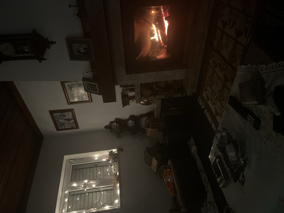 A dimly lit room features a fireplace with visible flames, and above it are framed pictures and a clock. A window, partially obscured by blinds and adorned with string lights, is also visible. A table covered with a white tablecloth is situated beside the fireplace, holding items like a remote control and a dish. The scene is dimly lit, creating a cozy and warm atmosphere.