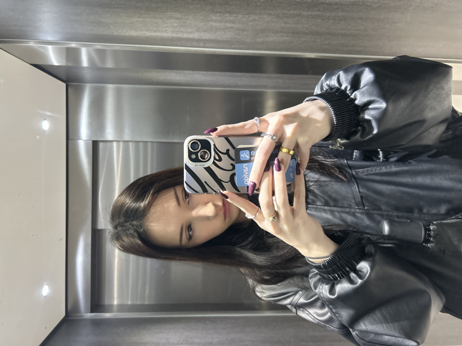 A woman in a black leather jacket takes a selfie in a mirror. She holds a phone with a zebra-striped case adorned with various rings on her fingers. Her nails are painted in a deep purple hue with a subtle glitter effect. The reflection shows an elevator interior with stainless steel panels. The woman's dark hair is styled in loose waves, framing her face as she angles the phone for the photograph.