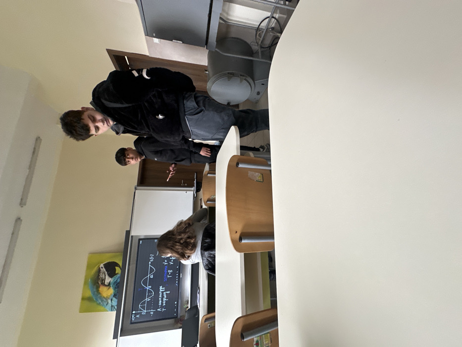 This image depicts a classroom in Stara Zagora, Bulgaria. The room has light-colored walls and is illuminated by ceiling-mounted fluorescent lights. Multiple white-topped desks with light brown wooden chairs are arranged within the space. On the left side of the room, a large interactive display exhibits a graph of a sine wave, accompanied by mathematical equations and Cyrillic text including "амплитуда" (amplitude) and "период" (period). A framed picture of a blue and yellow macaw is mounted above this display. Adjacent to the display on the right is a white whiteboard. A wooden door is visible in the background on the right. Further right, partially visible, is a piece of grey industrial-style equipment. Three individuals are present. In the immediate foreground on the right, a male teenager stands, facing left and slightly toward the camera. He wears a dark, textured jacket, dark pants, and a dark backpack, exhibiting a neutral expression while looking downward. In the midground, center-left, another male teenager stands, facing and looking directly into the camera. He is dressed in a dark hooded sweatshirt and dark pants, holding a light-colored smartphone in his left hand. To his left, a female teenager is seated at a desk with her back to the camera, observing the interactive display. She has long, wavy dark brown hair and wears a light gray top over a dark jacket. A laptop is positioned on the desk in front of the seated female.